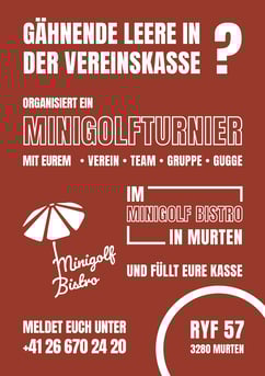 Seid ihr auf der Suche nach einem Angebot um eure Vereinskasse aufzufüllen? Hier seid ihr richtig! Das Minigolf Bistro in Murten bietet euch die Möglichkeit als Verein, Team, Gruppe oder Gugge euer eigenes Minigolfturnier zu organisieren.